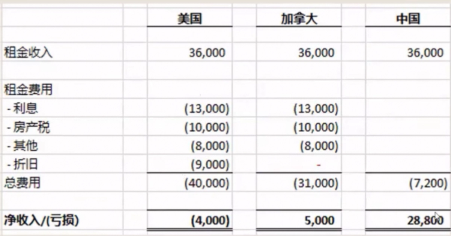 小张加拿大同样拿到3万6的房租,除了折旧费用,其他都可以抵减。假设小张选择不折旧,那么她的房租净收入为5千。